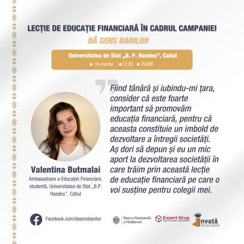 Valentina Butmalai, who is a student at the State University „B.P. Hasdeu ”from Cahul, states that it was decided to promote financial education in order to contribute to the development of the country „Being young and loving my country, I consider it very important to promote financial education, because it is an impetus for the development of the whole society…”