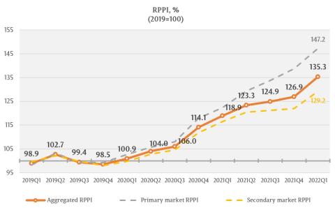The RPPI associated to dwellings listed on the secondary market has registered the value of 129.2 percent, that being a 5.9 percent increase compared to 4th quarter of 2021 and a 10.9 increase compared to the 1st quarter of 2021.