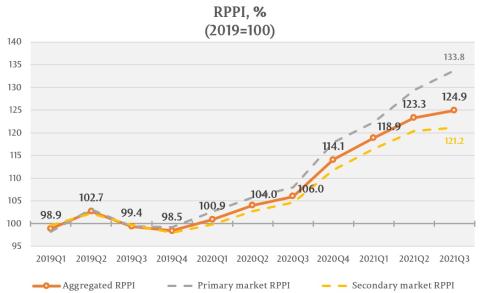 As of the end of the 3rd quarter of 2021, the offer price for the residential property in Chișinău has continued the increasing trend established since the first quarter of 2020. As of the end of the reporting period, the RPPI has registered the value of 124.9 percent, which is a 9.5 percent growth compared to the 4th quarter of 2020, and 17.9 percent growth compared to the 3rd quarter of 2020.