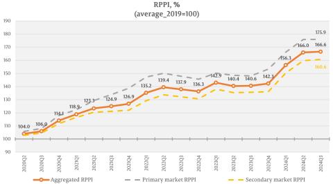 The RPPI associated to the new dwellings listed on the primary market has registered the value of 175.9 percent, mostly unchanged compared to 2nd quarter of 2024, and a 18.8 percent increase compared to the 3nd quarter of 2023.
