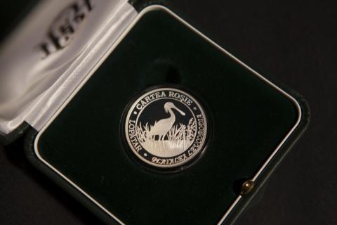 following the coin circumference – the inscriptions “CARTEA ROŞIE", "LOPĂTAR", "PLATALEA LEUCORODIA” are engraved in block letters.