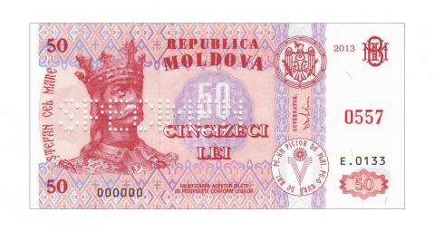 Faţa bancnotei : Stema Republicii Moldova, inscripţia "REPUBLICA MOLDOVA", portretul lui Ştefan cel Mare, un ornament naţional multicolor, două elemente decorative verticale, ghioşul central, valoarea nominală imprimată în cifre şi în litere, sigla "BNM", cuvântul “GUVERNATOR” şi semnătura în facsimil a guvernatorului Băncii Naţionale, textul pe cerc "PE-UN PICIOR DE PLAI, PE-O GURĂ DE RAI...", simbolul Victoriei - "V", anul imprimării bancnotei "2013", numărul şi seria bancnotei, textul "FALSIFICAREA ACESTOR BILETE SE PEDEPSEŞTE CONFORM LEGILOR". |