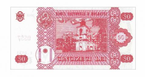 Versoul bancnotei : În interiorul unei rame imaginea grafică a Mănăstirii Hîrbovăţ cu inscripţia sub ea "MĂNĂSTIREA HÎRBOVĂŢ", valoarea nominală în cifre şi în litere, două elemente verticale decorative, Stema lui Ştefan cel Mare, imaginea stilizată a Columnei lui Traian, Coloana Infinitului iar între ele semiluna, denumirea băncii emitente "BANCA NAŢIONALĂ A MOLDOVEI", sigla "BNM". |
