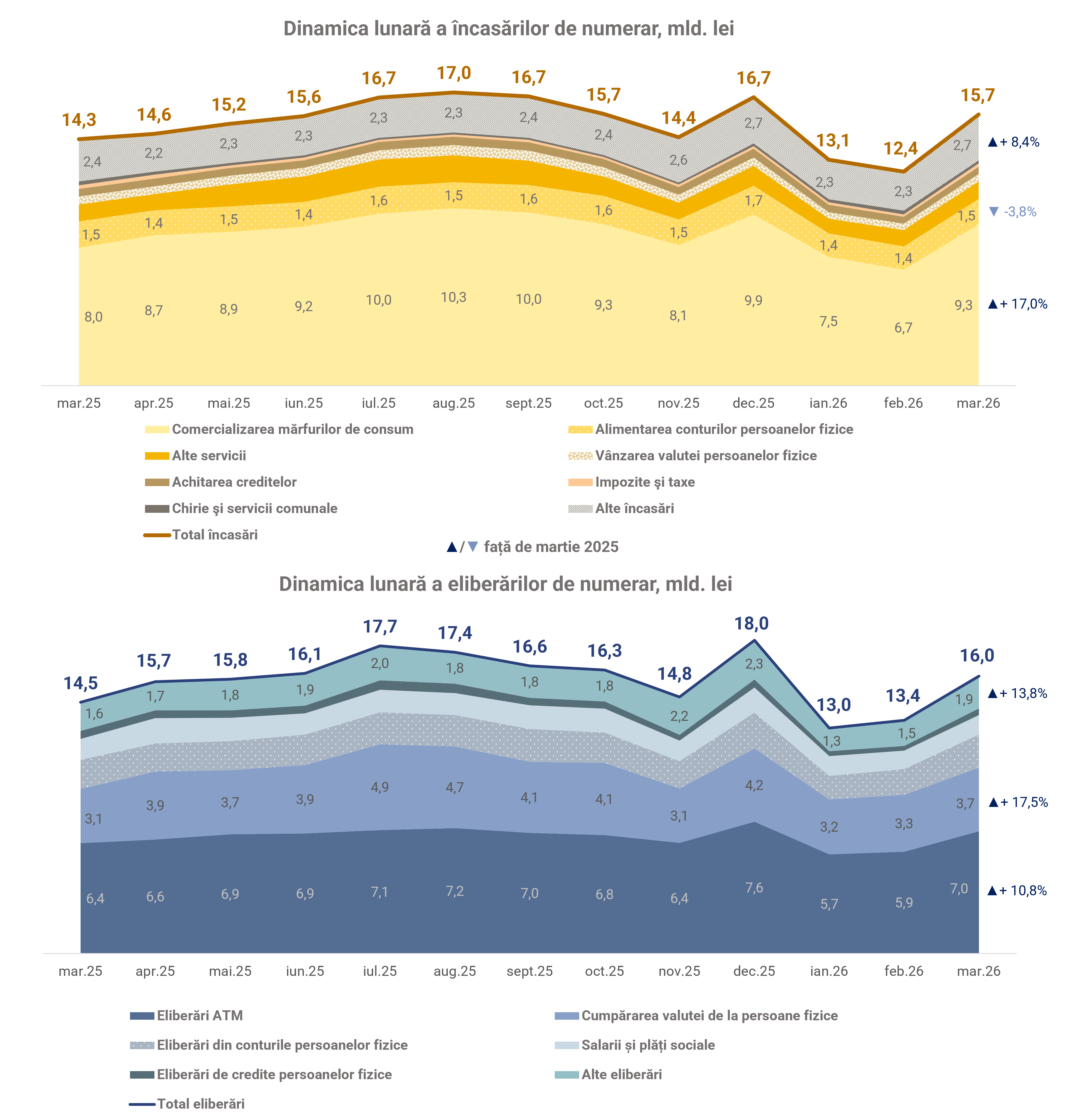 Volumul eliberărilor de numerar din casele băncilor, în martie 2026, a constituit 15 980 milioane lei,  majorându-se cu 1 516 milioane lei (+10,5 la sută) comparativ cu luna similară a anului precedent.