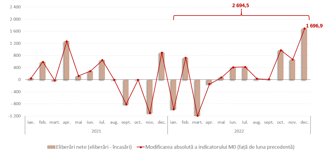 În decembrie 2022, banii în circulație (M0)1 au constituit 34 406,0 mil. lei, majorându-se cu 2 694,5 mil. lei (8,5 la sută) comparativ cu decembrie 2021 (diagrama nr.1) ca rezultat al depășirii în anul 2022 a volumului eliberărilor cumulative asupra volumului încasărilor cumulative pe sistemul bancar2 cu 2 694,6 mil. lei.