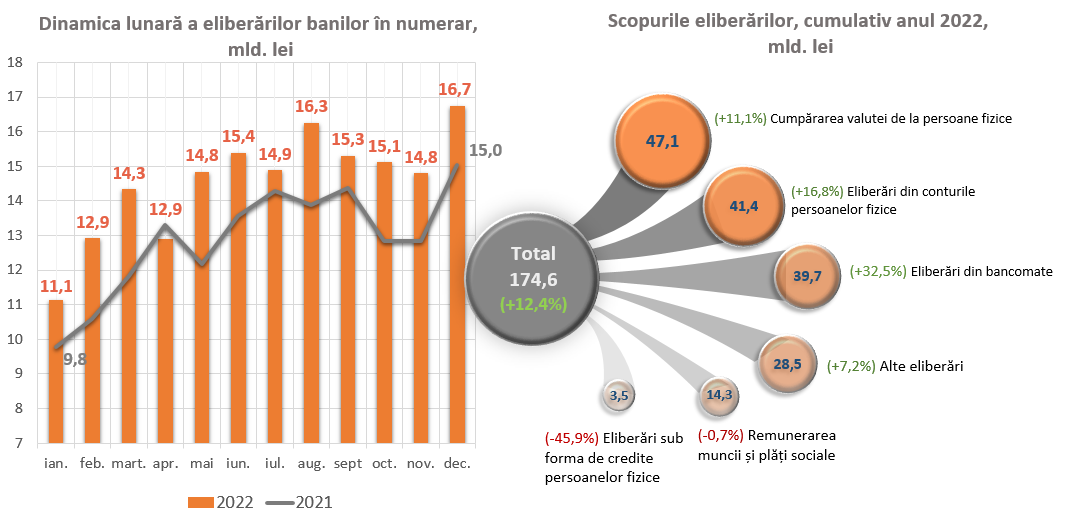 Dinamica respectivă a fost determinată, preponderent, de eliberările din bancomate cu o pondere semnificativă de 22,8 la sută din volumul total al eliberărilor, care s-au majorat în anul 2022 cu 9 736,3 mil. lei (sau +32,5 la sută) comparativ cu anul precedent, precum și de eliberările din conturile persoanelor fizice5 care au constituit 41 437,2 mil. lei, ceea ce reprezintă 23,7 la sută din volumul total al eliberărilor de numerar, înregistrând o majorare cu 5 945,3 mil. lei (sau +16,8 la sută).