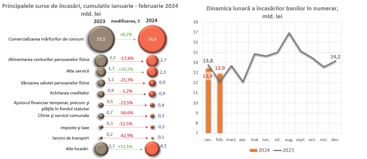 Totodată, în ianuarie – februarie 2024, au fost înregistrate diminuări considerabile ale încasărilor în numerar pe conturile curente și conturile de depozit ale persoanelor fizice cu 582,5 mil. lei (-17,6 la sută), ale încasărilor din chirii și servicii comunale cu 397,5 mil. lei (-56,6 la sută), precum și ale încasărilor din vânzarea valutei persoanelor fizice cu 242,2 mil. lei (-21,3 la sută), înregistrând 893,8 mil. lei (echivalentul a 50,3 mil. USD2).