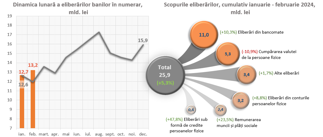 Un impact major asupra evoluției eliberărilor de bani în numerar din casele băncilor l-au avut, pe de o parte, majorarea eliberărilor din bancomate cu 1 033,6 mil. lei (+10,3 la sută), a eliberărilor pentru remunerarea muncii și plăților sociale cu 466,1 mil. lei (+23,5) la sută, a eliberărilor din conturile persoanelor fizice cu 261,5 mil. lei (+8,8 la sută), iar pe de altă parte, diminuarea eliberărilor pentru cumpărarea valutei de la persoane fizice cu 650,0 mil. lei (-10,9 la sută).