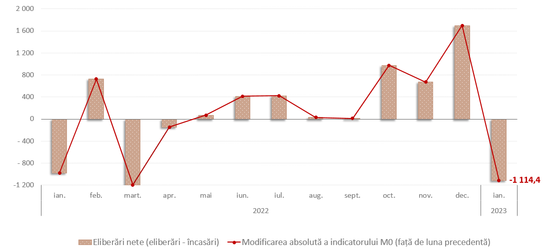 În ianuarie 2023, masa monetară M01 (bani în circulație) a constituit 33 291,5 mil. lei, micșorându-se cu -1 114,4 mil. lei (3,2 la sută) comparativ cu decembrie 2022 (diagrama nr.1) ca rezultat al diminuării în ianuarie 2023 a volumului eliberărilor cumulative față de volumul încasărilor cumulative al banilor în numerar pe sistemul bancar2 cu -1 114,4 mil. lei.