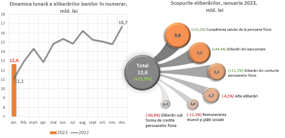 Totodată, în ianuarie 2023 au fost înregistrate diminuări ale eliberărilor de numerar sub forma de credite persoanelor fizice cu -214,7 mil. lei (-60,8 la sută), precum și ale eliberărilor pentru remunerarea muncii și plăți sociale cu -118,6 mil. lei (-11,1 la sută).