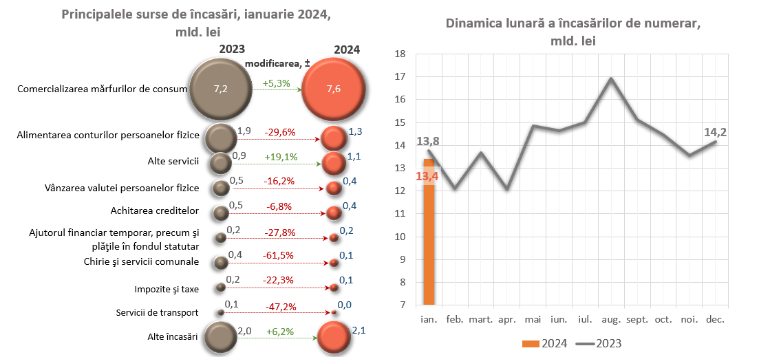 În ianuarie 2024, volumul încasărilor cumulative de numerar s-a diminuat cu 361,1 mil. lei (-2,6 la sută) față de ianuarie 2023 și a constituit 13 395,0 mil. lei.