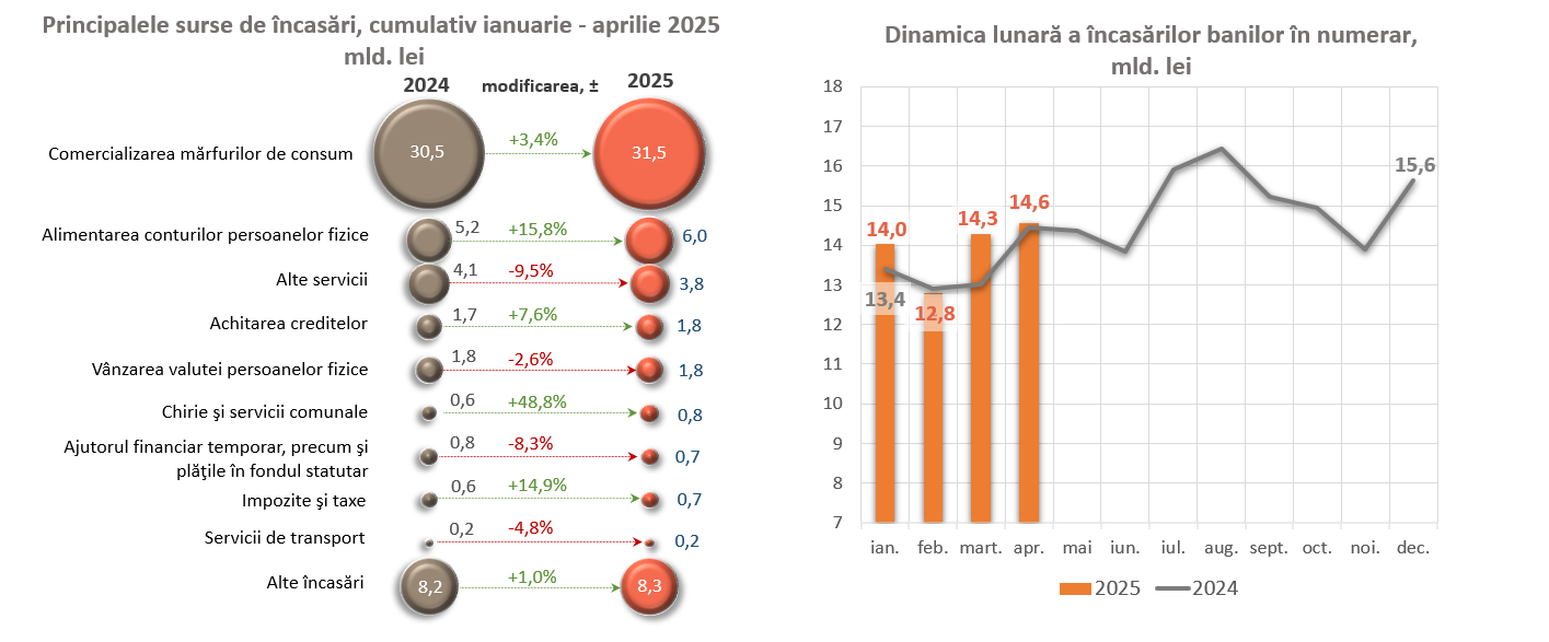 Încasările de numerar din comercializarea mărfurilor de consum (indiferent de canalul de desfacere) au înregistrat o majorare semnificativă de 1 025,2 mil. lei (+3,4 la sută), constituind 31 506,7 mil. lei, ceea ce reprezintă 56,6 la sută din volumul total al încasărilor (Diagrama nr. 1). De asemenea, au fost consemnate majorări substanțiale ale încasărilor de numerar pe conturile curente și conturile de depozit ale persoanelor fizice de 818,2 mil. lei (+15,8 la sută) și ale încasărilor din chirii și servicii comunale de 273,9 mil. lei (+48,8 la sută). Încasările de numerar pentru achitarea creditelor s-au majorat cu 128,0 mil. lei (+7,6 la sută).