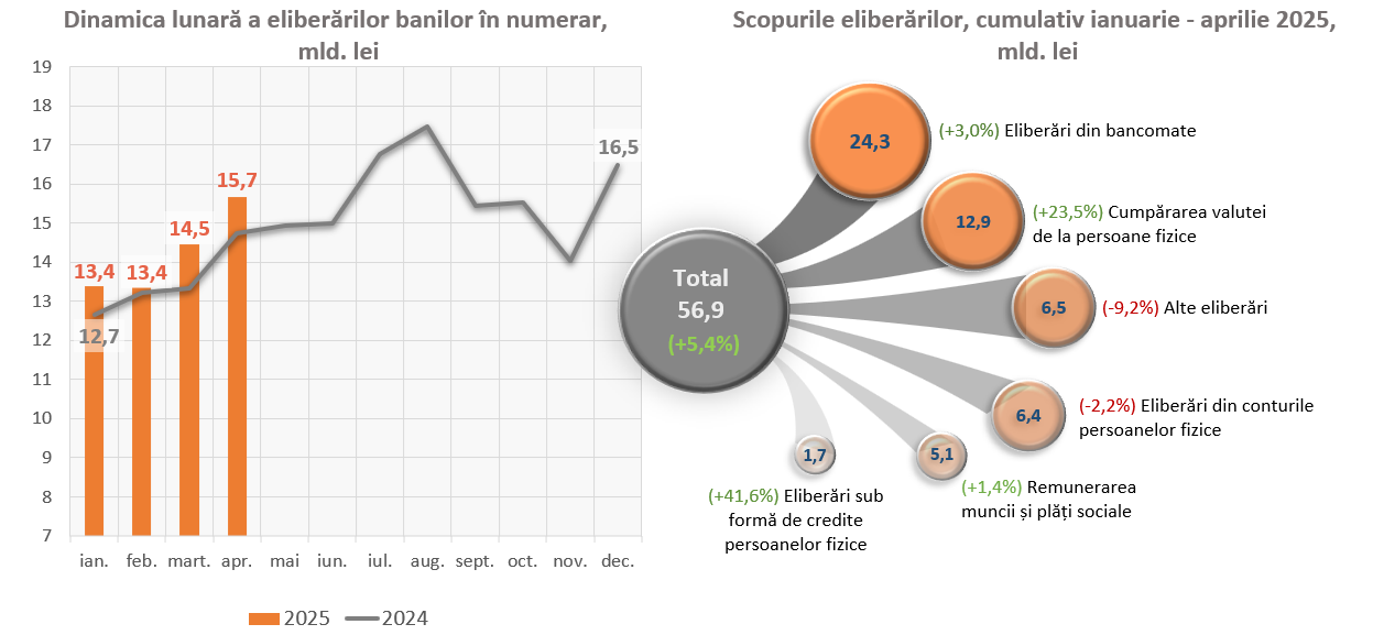 În ianuarie–aprilie 2025, volumul eliberărilor cumulative de numerar în casele băncilor a depășit cu 1 220,3 mil. lei volumul încasărilor cumulative de numerar pe sistemul bancar1.