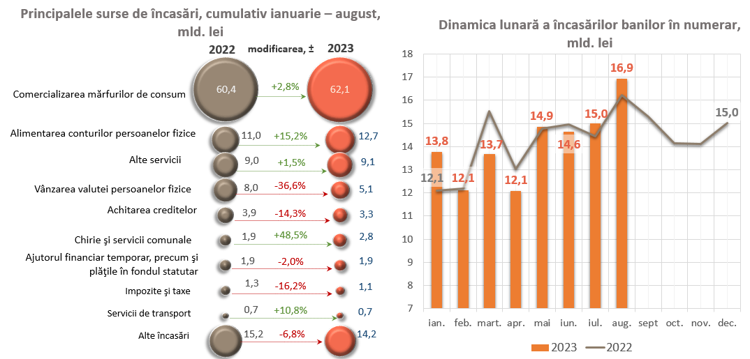 Totodată, la încasările cumulative a fost înregistrată o majorare substanțială a încasărilor din comercializarea mărfurilor de consum (indiferent de canalul de desfacere) cu 1 707,7 mil. lei (+2,8 la sută), constituind 62 068,3 mil. lei. De asemenea s-au majorat încasările pe conturile curente și conturile de depozit ale persoanelor fizice cu 1 682,6 mil. lei (+15,2 la sută), însumând 12 716,4 mil. lei.