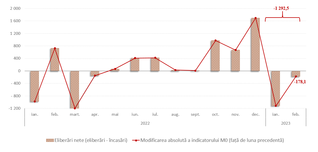 În februarie 2023, masa monetară M01 (bani în circulație) a constituit 33 113,4 mil. lei, micșorându-se cu 1 292,5 mil. lei (-3,8 la sută) comparativ cu decembrie 2022 (diagrama nr. 1) ca rezultat al diminuării în ianuarie – februarie 2023 a volumului eliberărilor cumulative față de volumul încasărilor cumulative al banilor în numerar pe sistemul bancar2 cu 1 292,5 mil. lei.