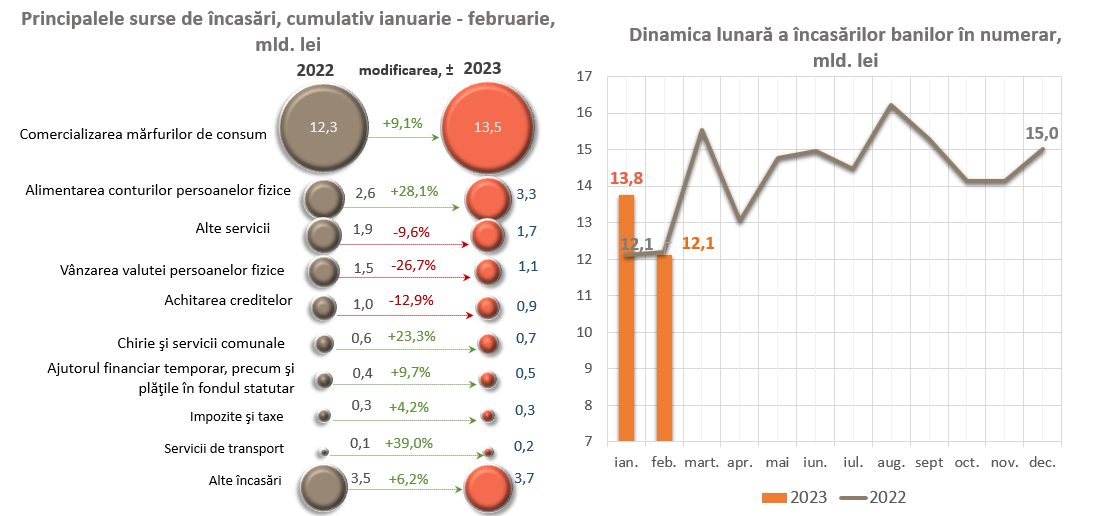 În ianuarie – februarie 2023, volumul încasărilor banilor în numerar s-a majorat cu 1 576,4 mil. lei (+6,5 la sută) față de perioada similară a anului precedent și a constituit 25 878,0 mil. lei.