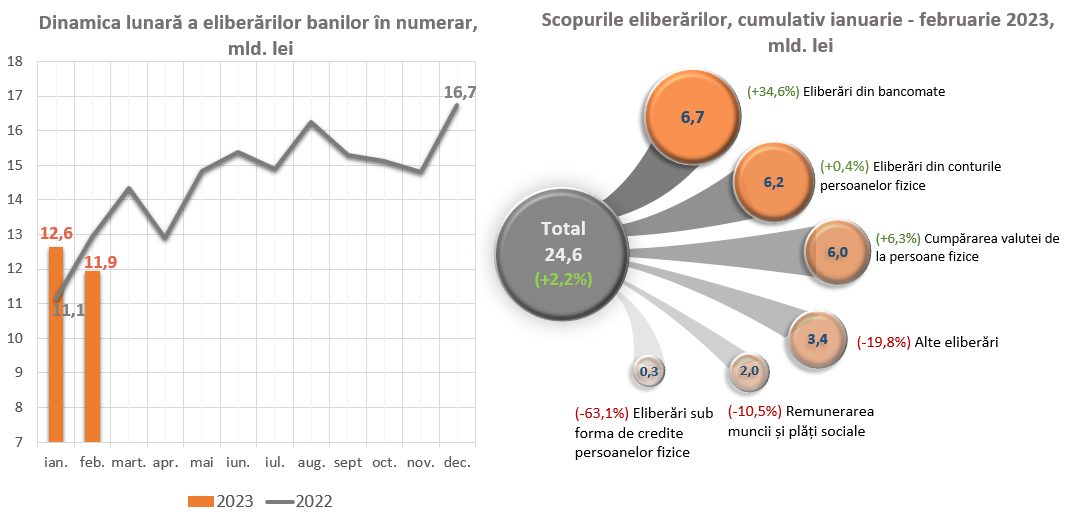 Totodată, în ianuarie-februarie 2023 au fost înregistrate diminuări ale eliberărilor de numerar sub formă de credite persoanelor fizice cu 509,4 mil. lei (-63,1 la sută), ale eliberărilor pentru remunerarea muncii și plățile sociale cu 232,0 mil. lei (-10,5 la sută), precum și ale eliberărilor în alte scopuri cu 832,3 mil. lei (-19,8 la sută).