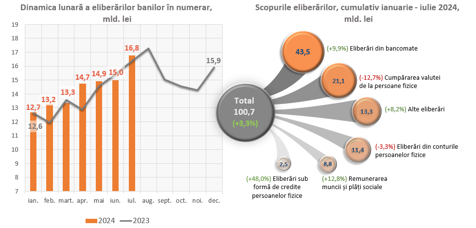Un impact major asupra evoluției eliberărilor de numerar din casele băncilor a avut, pe de o parte, majorarea eliberărilor din bancomate cu 3 913,8 mil. lei (+9,9 la sută), a eliberărilor în alte scopuri cu 1 012,1 mil. lei (+8,2 la sută) și a eliberărilor pentru remunerarea muncii și plăți sociale cu 1 006,6 mil. lei (+12,8 la sută), iar pe de altă parte, diminuarea eliberărilor pentru cumpărarea valutei de la persoane fizice cu 3 082,5 mil. lei (-12,7 la sută) și a eliberărilor de numerar din conturile persoanelor fizice cu 393,7 mil. lei (-3,3 la sută).