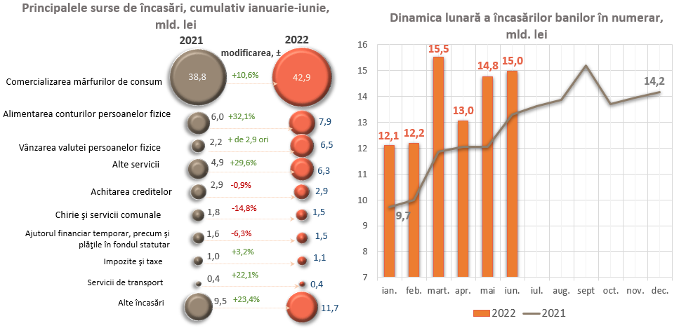 Totodată, în luna iunie 2022, volumul încasărilor a constituit 14 968,4 mil. lei (+1,4 la sută față de luna mai 2022 și +12,7 la sută față de luna iunie 2021).
