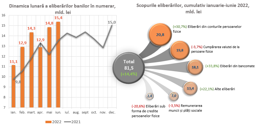 De menționat că, o pondere semnificativă de 22,2 la sută din volumul total al eliberărilor au avut eliberările din bancomate, care s-au majorat în perioada ianuarie - iunie 2022 cu 33,8 la sută comparativ cu perioada similară a anului precedent.