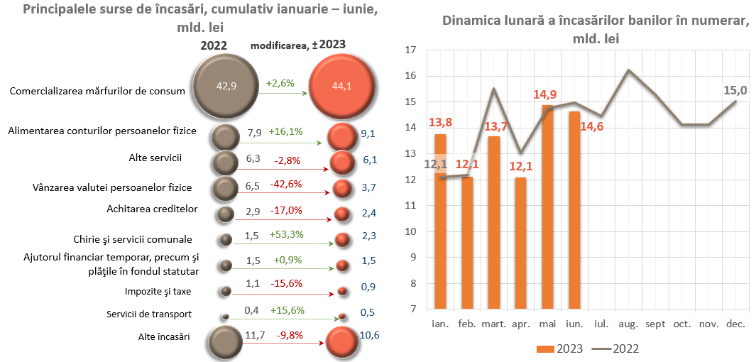 Totodată, încasările pe conturile curente și conturile de depozit ale persoanelor fizice s-au majorat cu 1 266,0 mil. lei (+16,1 la sută), însumând 9 137,0 mil. lei. De asemenea, un impact semnificativ l-au avut și încasările din comercializarea mărfurilor de consum (indiferent de canalul de desfacere) care s-au majorat cu 1 114,3 mil. lei (+2,6 la sută), constituind 44 052,1 mil. lei.