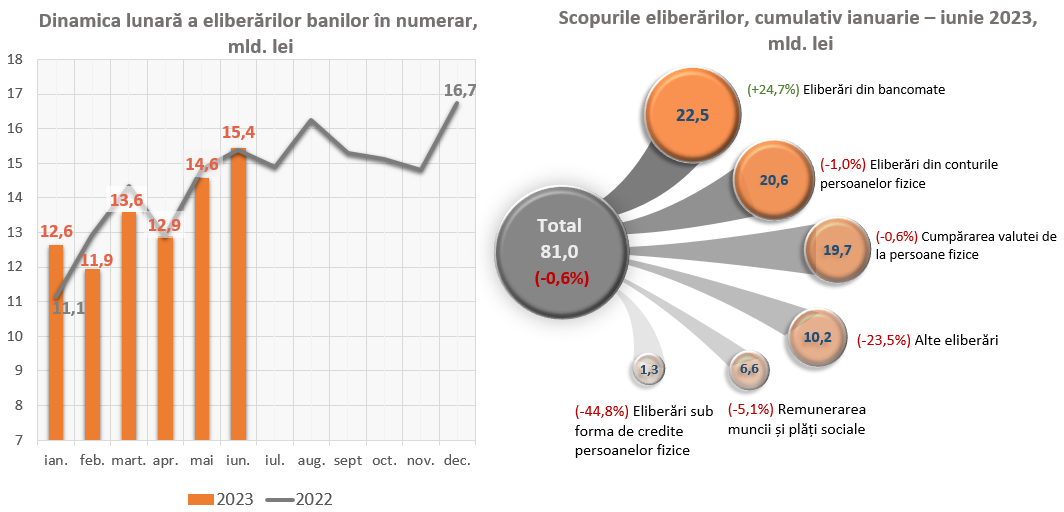 Evoluția respectivă a fost determinată, pe de o parte, de diminuarea eliberărilor în alte scopuri cu 3 150,5 mil. lei (-23,5 la sută) și eliberărilor sub formă de credite persoanelor fizice cu 1 069,9 mil. lei (-44,8 la sută), iar pe de altă parte, de majorarea eliberărilor din bancomate cu 4 463,0 mil. lei (+24,7 la sută).