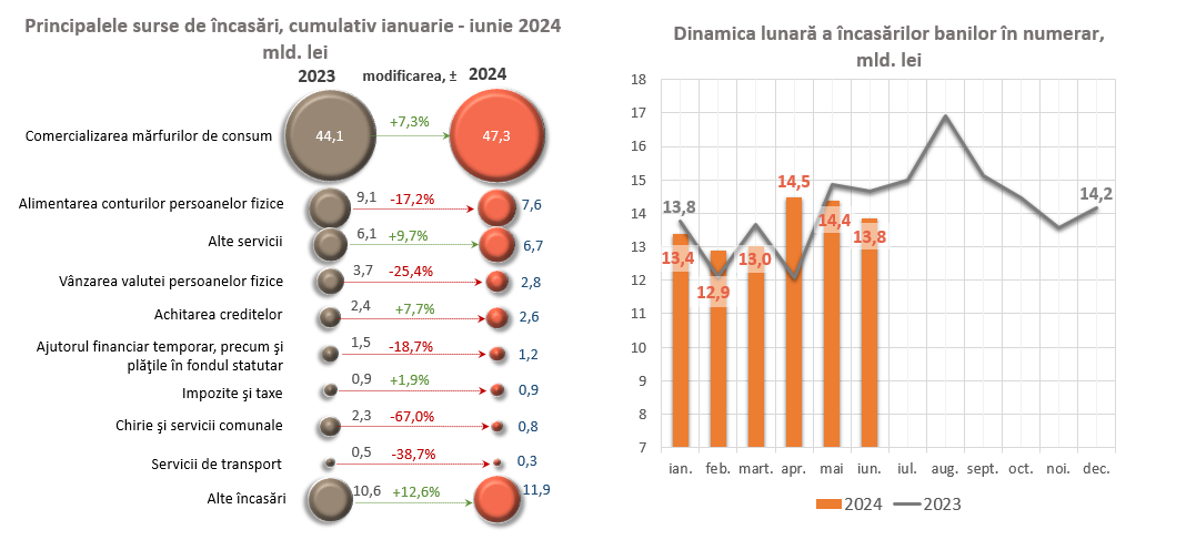 În ianuarie – iunie 2024, volumul eliberărilor cumulative de numerar din casele băncilor a depășit cu 1 930,2 mil. lei volumul încasărilor cumulative de numerar pe sistemul bancar1.