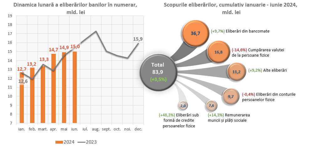 Un impact major asupra evoluției eliberărilor de numerar din casele băncilor a avut, pe de o parte, majorarea eliberărilor din bancomate cu 3 259,5 mil. lei (+9,7 la sută), a eliberărilor pentru remunerarea muncii și plăți sociale cu 946,8 mil. lei (+14,3 la sută) la sută și a eliberărilor în alte scopuri cu 941,7 mil. lei (+9,2 la sută), iar pe de altă parte, diminuarea eliberărilor pentru cumpărarea valutei de la persoane fizice cu 2 880,8 mil. lei (-14,6 la sută).