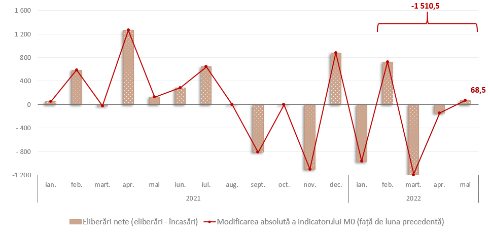 În mai 2022, banii în circulație (M0)1 au constituit 30 188,2 mil. lei, micșorându-se cu 1 510,5 mil. lei (5,1 la sută) comparativ cu decembrie 2021 (diagrama nr.1) ca rezultat al depășirii în perioada ianuarie - mai 2022 a volumului încasărilor cumulative asupra volumului eliberărilor cumulative pe sistemul bancar2 cu 1 523,2 mil. lei.