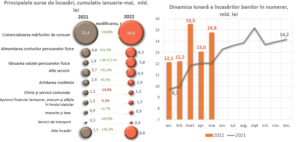 În perioada ianuarie - mai 2022, volumul încasărilor banilor în numerar s-a majorat cu 21,4 la sută față de perioada similară a anului precedent și a constituit 67 635,8 mil. lei. Creșterea volumului încasărilor de mijloace bănești a fost determinată, preponderent, de majorarea cu 10,8 la sută a încasărilor din comercializarea mărfurilor de consum (indiferent de canalul de desfacere), care dețin cea mai mare pondere (de 51,5 la sută) din volumul total al încasărilor (Diagrama nr. 2). Totodată, încasările de la vânzarea valutei persoanelor fizice s-au majorat de 3,3 ori, constituind 5 786,2 mil.lei (echivalentul a 315,7 mil. USD3).