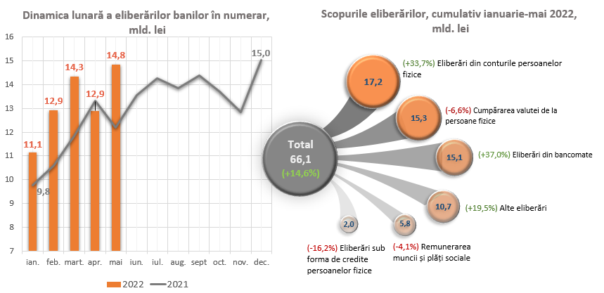 De menționat că, o pondere semnificativă de 22,8 la sută din volumul total al eliberărilor au avut eliberările din bancomate, care s-au majorat în perioada ianuarie - mai 2022 cu 37,0 la sută comparativ cu perioada similară a anului precedent.