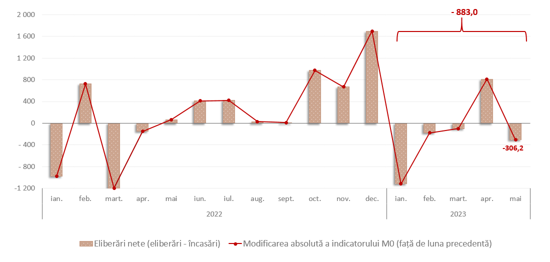 În luna mai 2023, masa monetară M01 (bani în circulație) a constituit 33 523,0 mil. lei, micșorându-se cu 883,0 mil. lei (-2,6 la sută) comparativ cu decembrie 2022 (diagrama nr. 1) ca rezultat al diminuării în ianuarie – mai 2023 a volumului eliberărilor cumulative față de volumul încasărilor cumulative al banilor în numerar pe sistemul bancar2 cu 882,9 mil. lei.