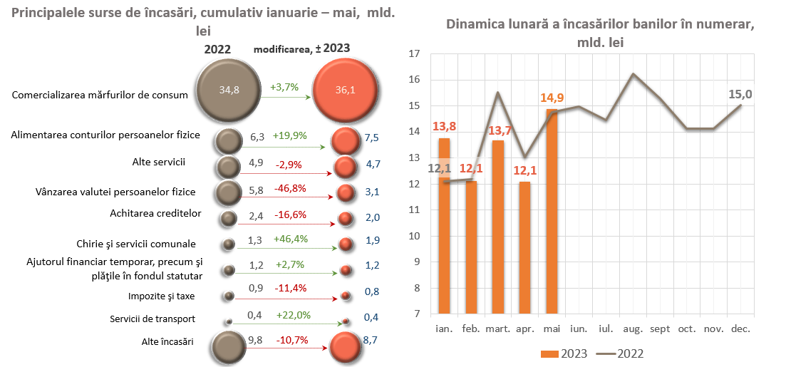 În ianuarie – mai 2023, volumul încasărilor banilor în numerar s-a diminuat cu 1 139,4 mil. lei (-1,7 la sută) față de perioada similară a anului precedent și a constituit 66 496,4 mil. lei.