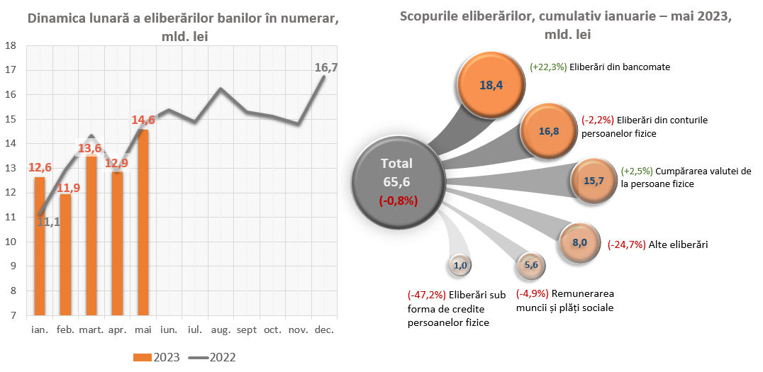Totodată, în ianuarie – mai 2023 eliberările din bancomate s-au majorat cu 3 357,9 mil. lei (+22,3 la sută) comparativ cu perioada similară a anului precedent, care a constituit 18 411,1 mil. lei, având o pondere de 28,1 la sută din volumul total al eliberărilor de numerar. De asemenea, a fost înregistrată o majorare semnificativă de 381,0 mil. lei (+2,5 la sută) a volumului eliberărilor de numerar pentru cumpărarea valutei de la persoane fizice, care a constituit 15 715,1 mil. lei (echivalentul a 850,0 mil. USD6), ceea ce reprezintă o pondere de 24,0 la sută din volumul total al eliberărilor de numerar.