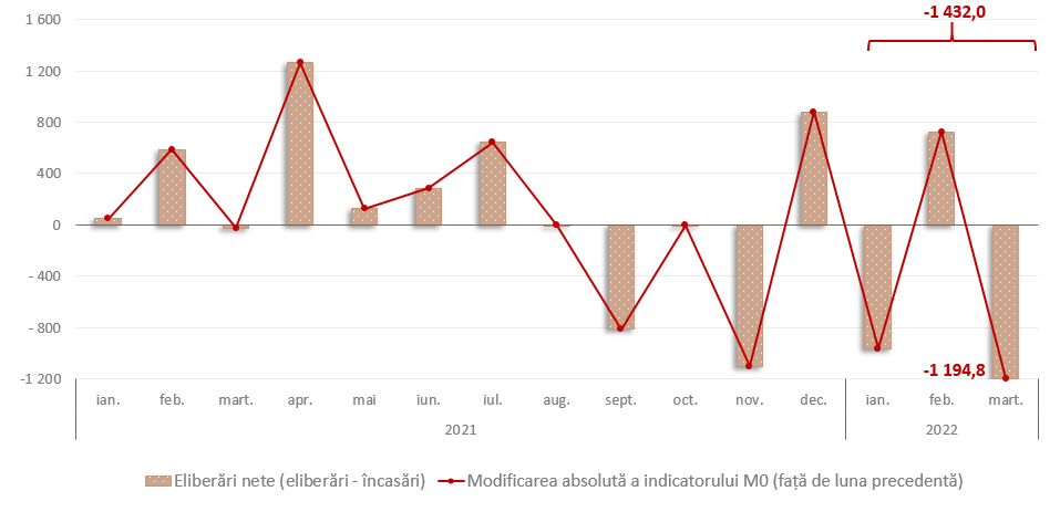 În martie 2022, banii în circulație (M0)1 au constituit 30 266,6 mil. lei, micșorându-se cu 1 432,0 mil. lei (4,5 la sută) comparativ cu decembrie 2021 (diagrama nr.1) ca rezultat al depășirii în perioada ianuarie - martie 2022 a volumului încasărilor cumulative asupra volumului eliberărilor cumulative pe sistemul bancar2 cu 1 432,0 mil. lei.