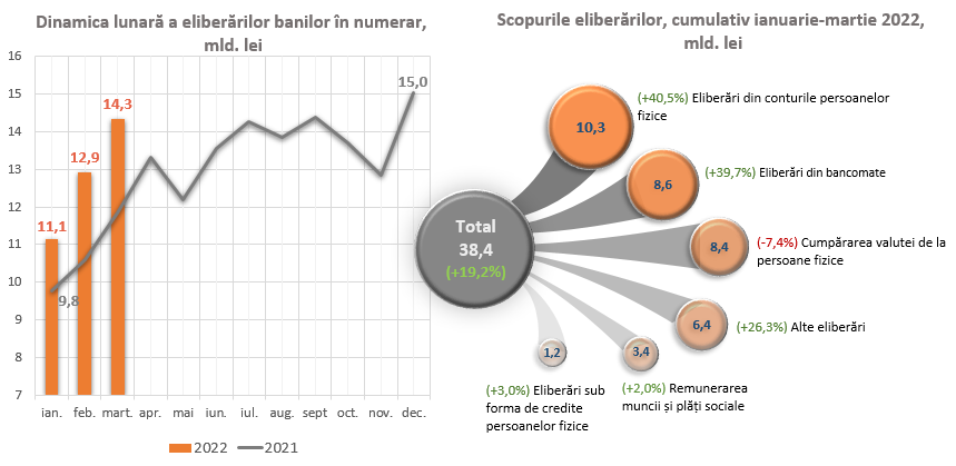 În luna martie 2022 volumul eliberărilor a constituit 14 333,3 mil. lei, fiind inferior volumului încasărilor cu 1194,7 mil. lei. Comparativ cu luna februarie 2022, eliberările de numerar s-au majorat cu 1 418,3 mil. lei sau cu 11,0 la sută.