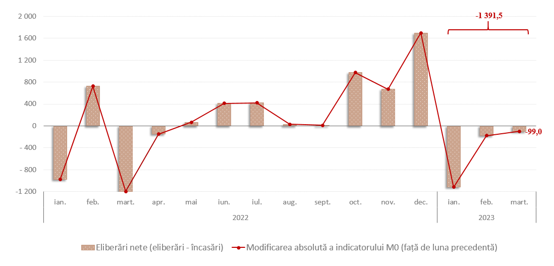 În martie 2023, masa monetară M01 (bani în circulație) a constituit 33 014,5 mil. lei, micșorându-se cu 1 391,5 mil. lei (-4,0 la sută) comparativ cu decembrie 2022 (diagrama nr. 1) ca rezultat al diminuării în ianuarie – martie 2023 a volumului eliberărilor cumulative față de volumul încasărilor cumulative al banilor în numerar pe sistemul bancar2 cu 1 391,4 mil. lei.