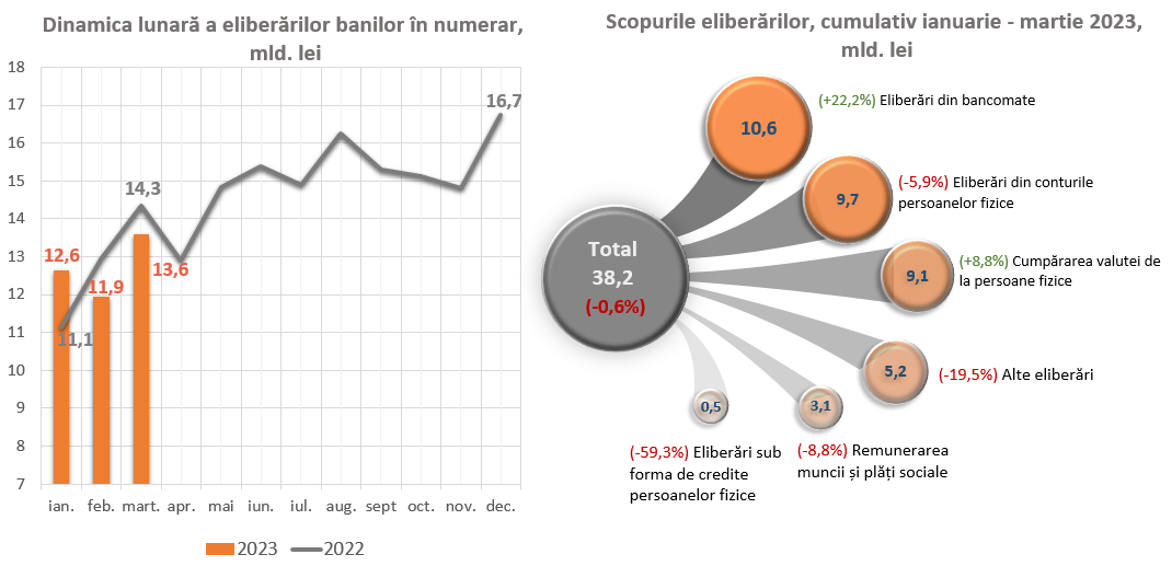 Totodată, în ianuarie – martie 2023 eliberările din bancomate s-au majorat cu 1 921,3 mil. lei (+22,2 la sută) comparativ cu perioadă similară a anului precedent, care a constituit 10 561,4 mil. lei, având o pondere de 27,7 la sută din volumul total al eliberărilor de numerar. De asemenea, a fost înregistrată o majorare semnificativă de 735,9 mil. lei (+8,8 la sută) a volumului eliberărilor de numerar pentru cumpărarea valutei de la persoane fizice, care a constituit 9 140,0 mil. lei (echivalentul a 485,0 mil. USD6), ceea ce reprezintă o pondere de 23,9 la sută din volumul total al eliberărilor de numerar.