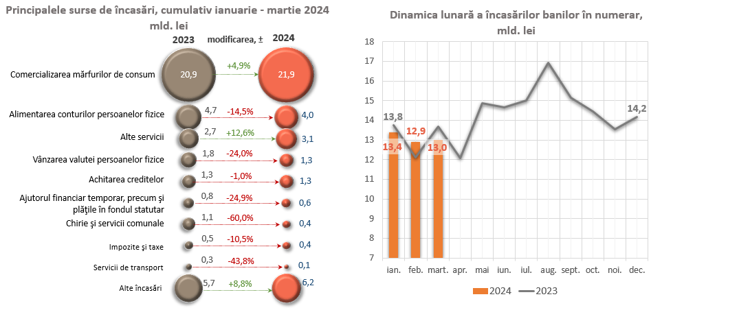 Diminuări semnificative ale încasărilor de numerar au fost înregistrate la încasările pe conturile curente și conturile de depozit ale persoanelor fizice cu 672,8 mil. lei (-14,5 la sută), la încasările din chirii și servicii comunale cu 658,3 mil. lei (-60,0 la sută), precum și la încasările din vânzarea valutei persoanelor fizice cu 421,8 mil. lei (-24,0 la sută), însumând 1 337,1 mil. lei (echivalentul a 75,4 mil. USD2).