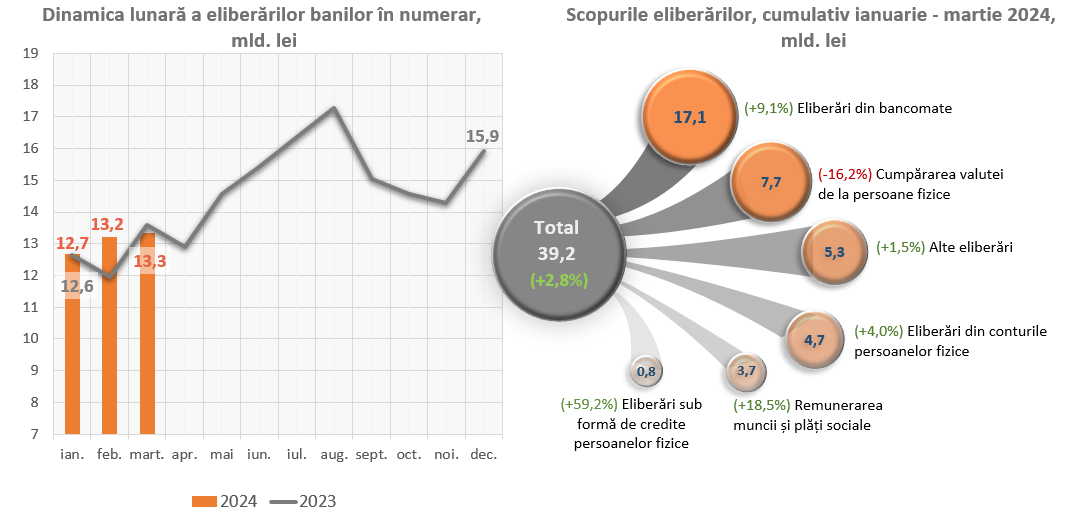 Un impact major asupra evoluției eliberărilor de numerar din casele băncilor l-au avut, pe de o parte, majorarea eliberărilor din bancomate cu 1 433,1 mil. lei (+9,1 la sută), a eliberărilor pentru remunerarea muncii și plăților sociale cu 573,6 mil. lei (+18,5) la sută, a eliberărilor sub formă de credite persoanelor fizice cu 291,4 mil. lei (+59,2), iar pe de altă parte, diminuarea eliberărilor pentru cumpărarea valutei de la persoane fizice cu 1 479,3 mil. lei (-16,2 la sută).