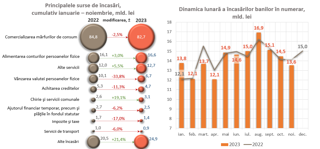 Volumul încasărilor cumulative al banilor în numerar în casele băncilor, în ianuarie – noiembrie 2023, s-a diminuat cu 630,0 mil. lei comparativ cu perioada similară a anului precedent și a constituit 156 205,9 mil. lei.