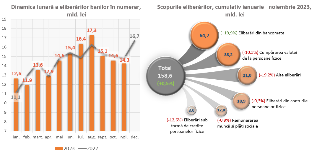 Un impact major asupra evoluției eliberărilor de bani în numerar din casele băncilor l-au avut, pe de o parte, majorarea eliberărilor din bancomate cu 10 739,7 mil. lei (+19,9 la sută), iar pe de altă parte, diminuarea eliberărilor în alte scopuri cu 5 014,7 mil. lei (-19,2 la sută), a eliberărilor de numerar pentru cumpărarea valutei de la persoane fizice cu 4 363,8 mil. lei (-10,3 la sută) și a eliberărilor de numerar sub formă de credite persoanelor fizice cu 424,7 mil. lei (-12,6 la sută).