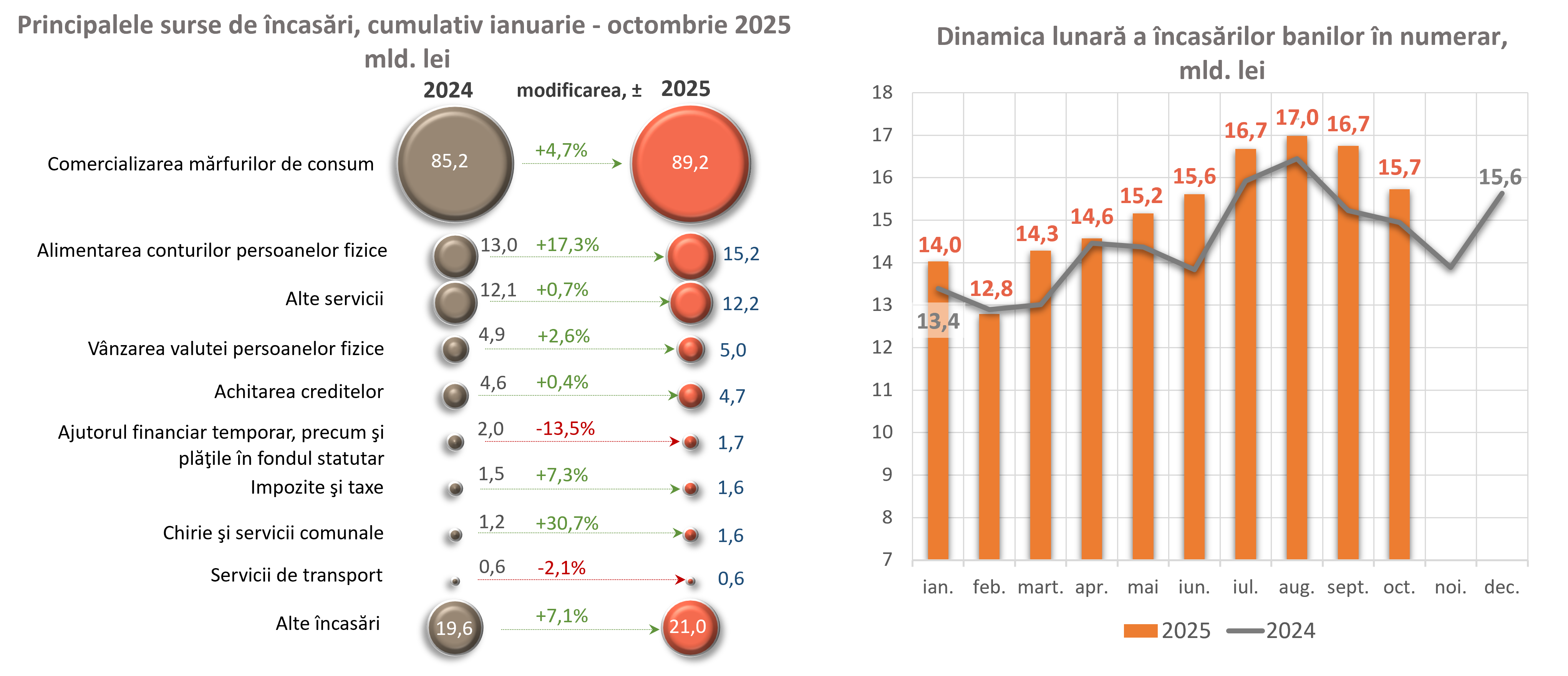 Volumul eliberărilor cumulative de numerar din casele băncilor, în ianuarie–octombrie 2025, a constituit 156 805,5 milioane lei,  majorându-se cu 7 673,5 milioane lei (+5,1 la sută) comparativ cu perioada similară a anului precedent.