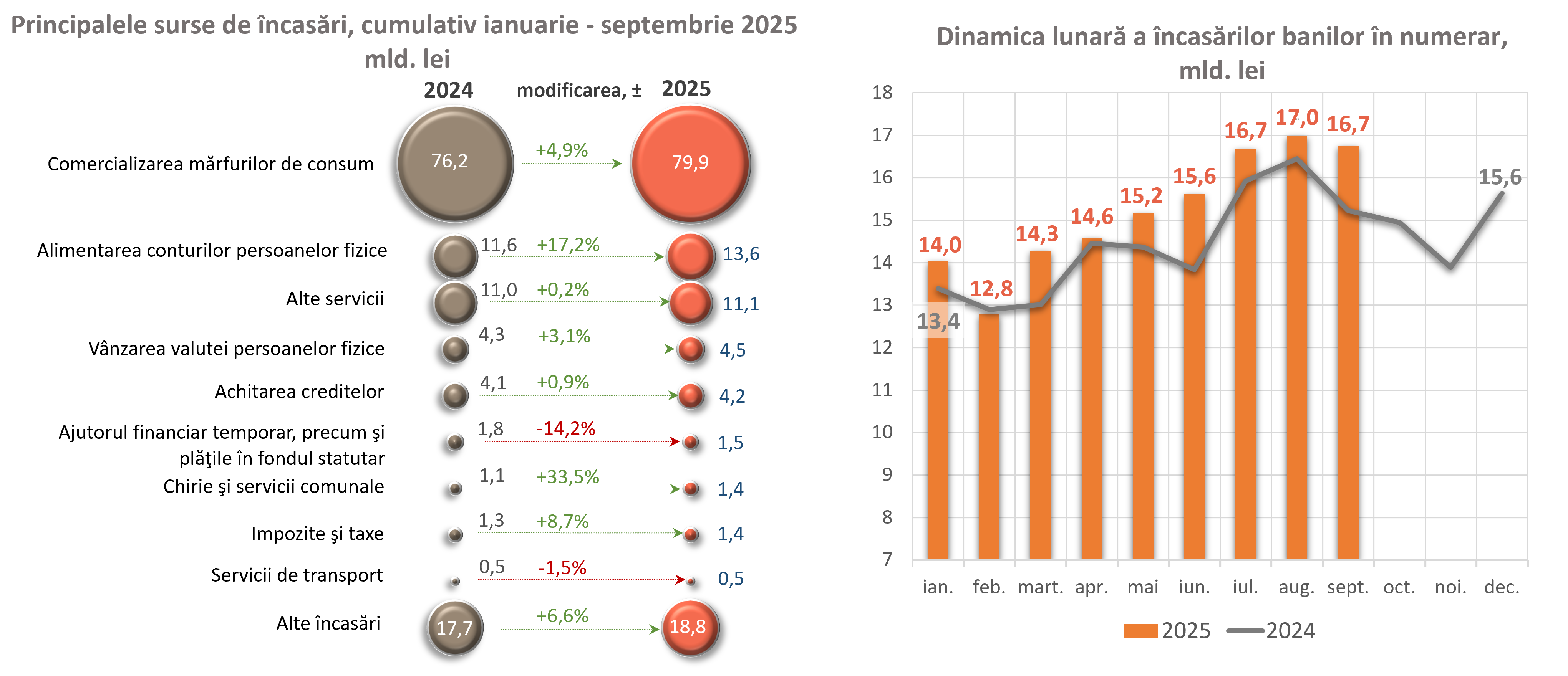 Volumul încasărilor de numerar pe conturile curente și conturile de depozit ale persoanelor fizice a înregistrat valoarea de 13 587,4 milioane lei, în creștere cu 1 996,1 milioane lei (+17,2 la sută).