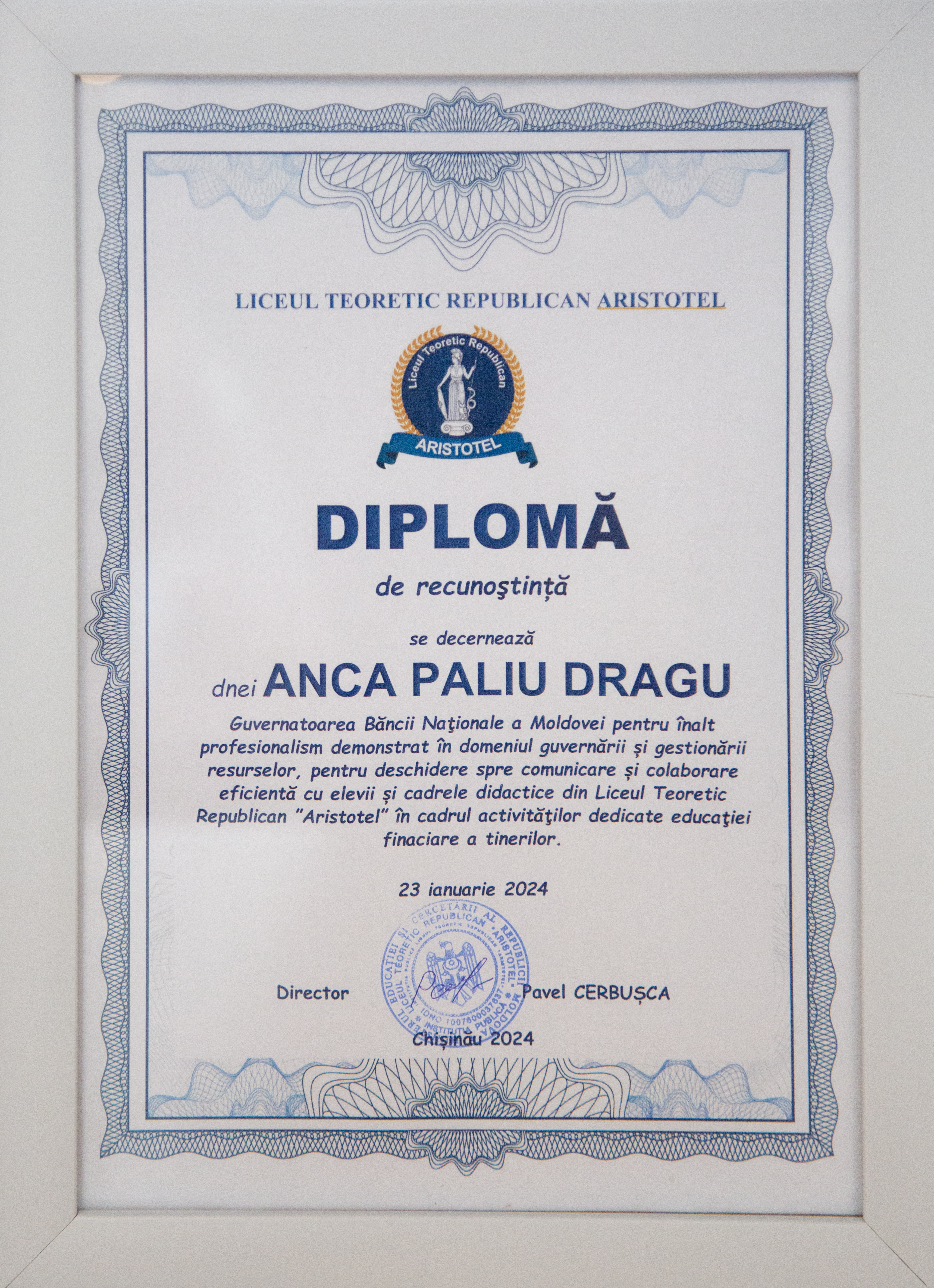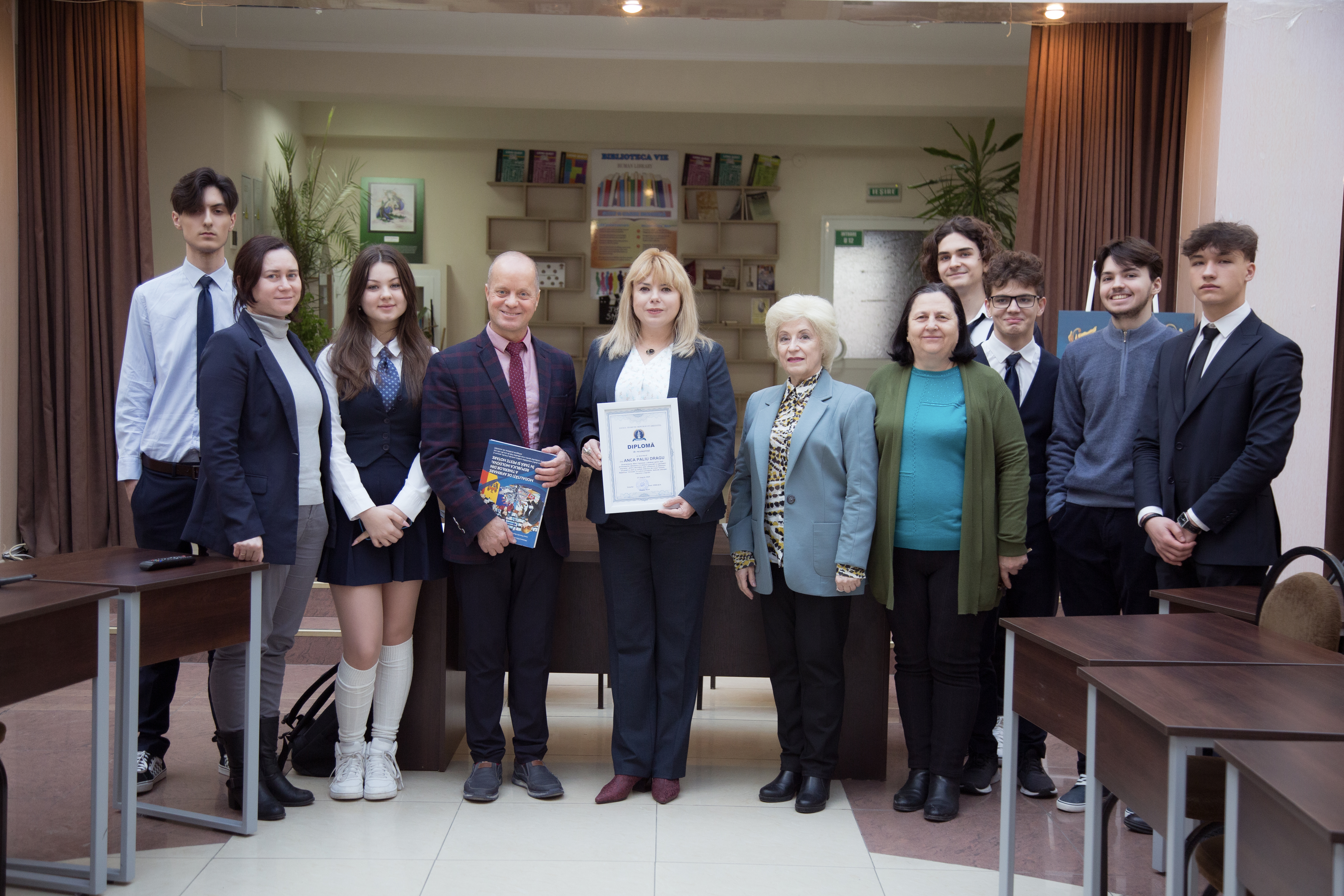 La finalul discuțiilor, Anca Dragu a primit de la elevi o diplomă de recunoștință pentru profesionalism, deschidere spre comunicare și colaborare eficientă în cadrul activităților dedicate educației financiare a tinerilor.