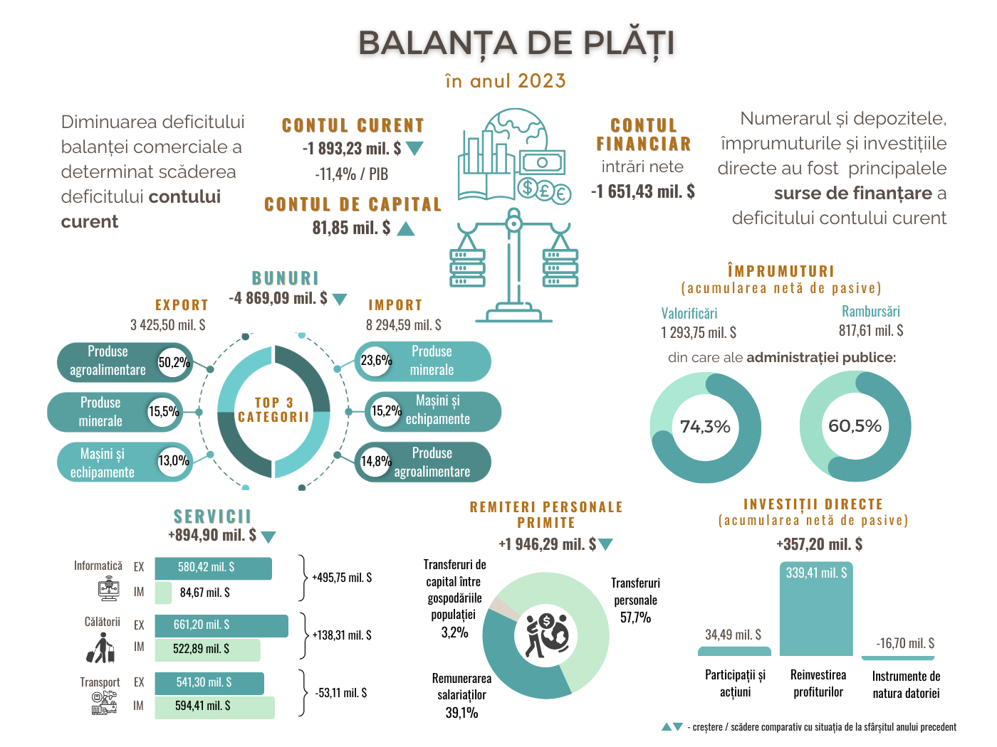 Conform datelor finale, în anul 2023, deficitul contului curent al balanței de plăți a Republicii Moldova s-a diminuat cu 23,7 la sută comparativ cu anul 2022 și a constituit 1 893,23 mil. USD sau 11,4 la sută raportat la PIB. Evoluția deficitului contului curent a fost determinată de scăderea deficitului balanței comerciale cu bunuri (-6,2 la sută), de majorările excedentelor veniturilor primare (de 4,5 ori) și secundare (cu 4,1 la sută), în timp ce excedentul balanței serviciilor s-a diminuat (-1,5 la sută).