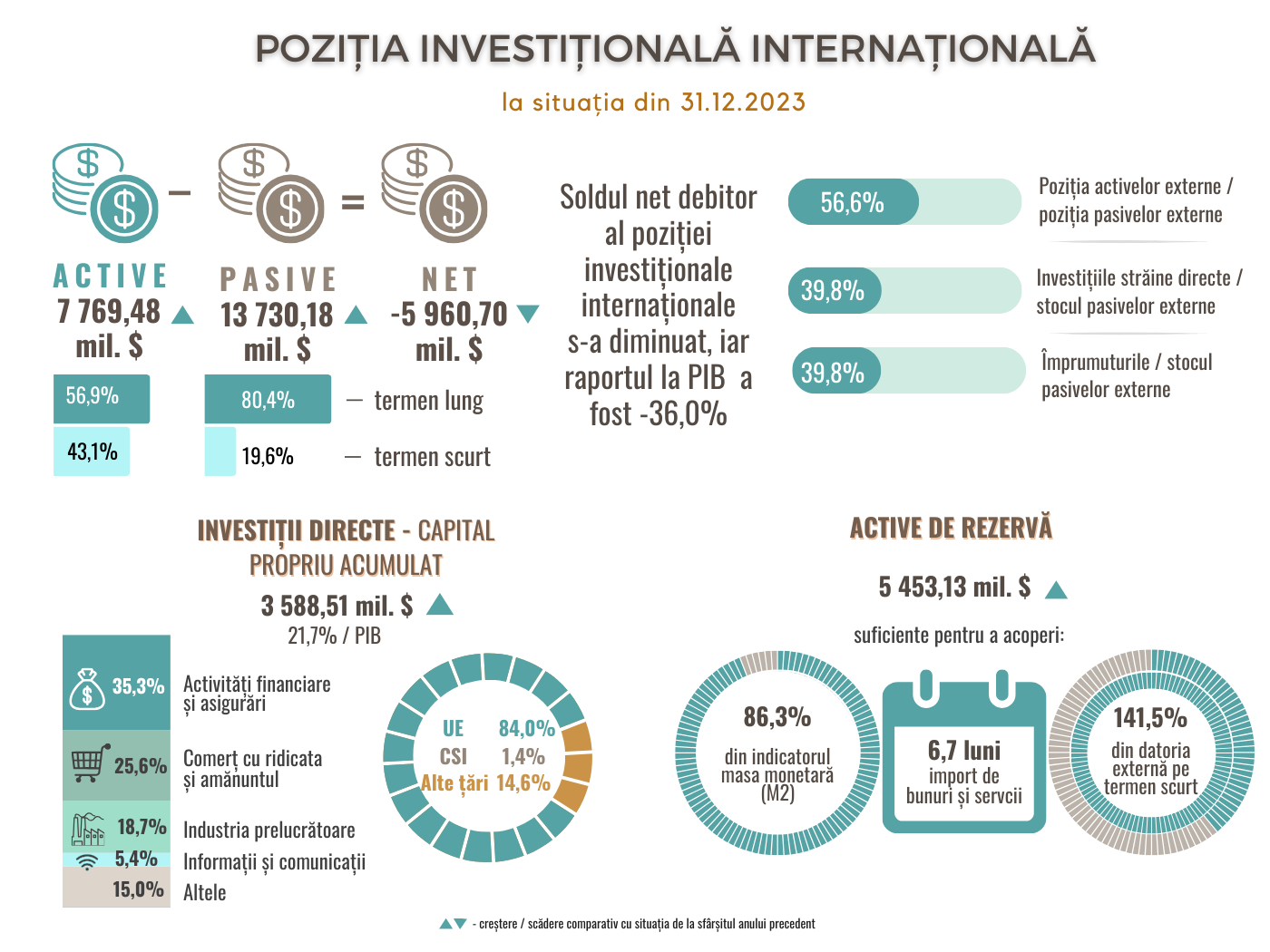 Poziția investițională internațională a Republicii Moldova, la 31.12.2023, a constituit -5 960,70 mil. USD (sau 36,0 la sută relativ la PIB), soldul net debitor diminuându-se cu 3,9 la sută față de sfârșitul anului 2022.