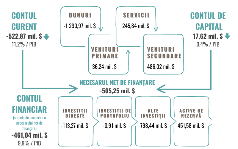 Suma soldurilor contului curent și contului de capital denotă că, drept rezultat al tranzacțiilor curente și de capital ale rezidenților Republicii Moldova cu nerezidenții, necesarul net de finanțare externă, în trimestrul IV 2023, a constituit 505,25 mil. USD, ceea ce reprezintă 10,8 la sută în raport cu PIB.