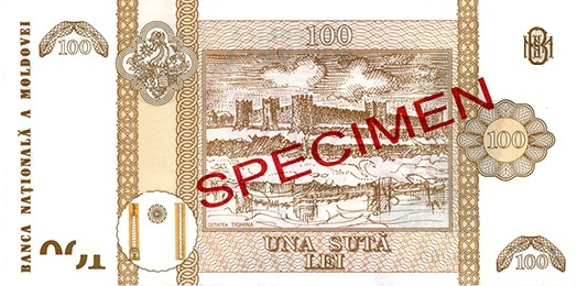 Reversul bancnotei : În interiorul unei rame imaginea grafică a Cetăţii Tighina cu textul sub ea „CETATEA TIGHINA”, valoarea nominală în cifre şi în litere, trei elemente verticale decorative, Stema lui Ştefan cel Mare, imaginea stilizată a Columnei lui Traian, Coloana Infinitului, iar între ele semiluna, textul „BANCA NAŢIONALĂ A MOLDOVEI” și sigla BNM. |