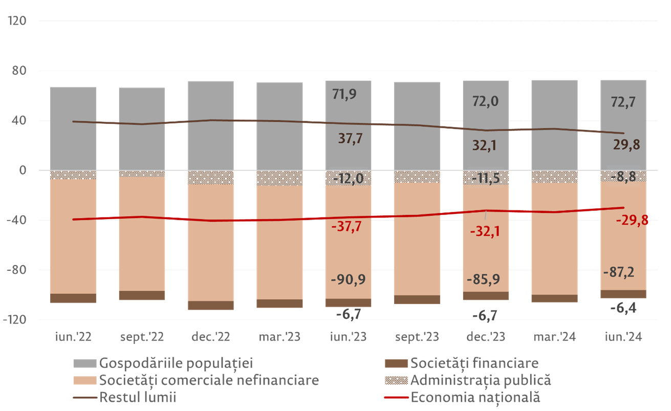 Sectorul gospodăriilor populației continuă să fie creditorul net al economiei naționale, iar sectorul societăților comerciale nefinanciare, sectorul societăților financiare și sectorul administrației publice se află, la fel ca în perioadele precedente, pe poziția de debitor net (a se vedea tabelul de mai jos).